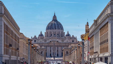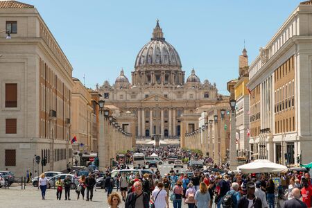 Via della Conciliazione, St. Peter's Basilica, Vatican, people walk. Rome, Italy, May 2019.