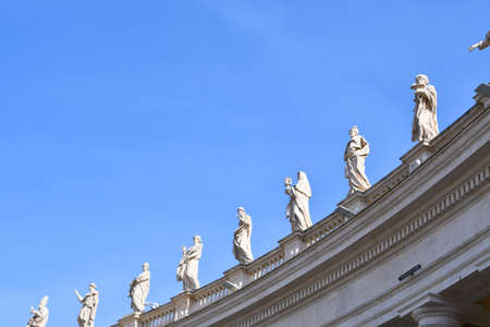 Religious figures in white marble under the columns of Square of San Pietro in Rome during a sunny day with blue sky