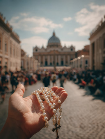 A hand displays a rosary while St Peters Basilica looms in the background, filled with visitors and bathed in warm sunlight on a clear day.