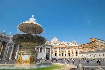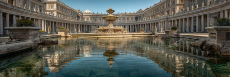 Splendid fountain in the Vatican City produces beautiful reflections in tranquil waters, surrounded by grand architecture under a clear midday sky.