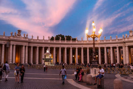 Rome, Italy - August 19, 2016: Square of St Peter at sunset with sunlight at background. It is located directly in front of St. Peter's Basilica in the Vatican City and was designed by Bernini