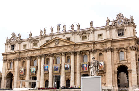 Facade and dome of The Papal Basilica of Saint Peter in the Vatican (Basilica di San Pietro), a Renaissance style church in Vatican City, within the city of Rome, Italy