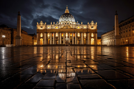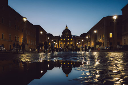 Panoramic night view of St Peters Basilica with beautiful reflection in Vatican City. Architecture, landmark and attractions of Rome, Italy. High quality photo