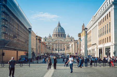 Rome, Italy - October 2019: View from Via della Conciliazione (Road of the Conciliation), one of historic street in Rome, Italy, towards St. Peter's Basilica in Vatican City