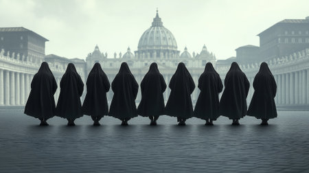A group of nuns stands in formation, praying quietly in St. Peter's Square, Rome. The early morning light casts a serene atmosphere around the iconic Basilica.