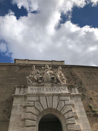 Exterior view of main entrance to the Vatican Museum with blue sky and white clouds
