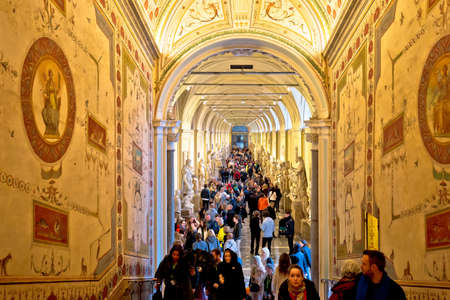 Vatican, March 26 2019: Vatican museum art hallway and tourist crowd view. Vatican museum is visited by many tourists and is famous tourist spot.