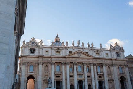 Facade and dome of The Papal Basilica of Saint Peter in the Vatican (Basilica di San Pietro), a Renaissance style church in Vatican City, within the city of Rome, Italy