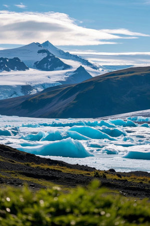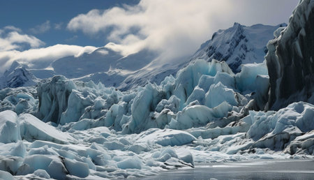 Captivating glacial landscape featuring stunning blue ice textures and tranquil water reflecting the dramatic clouds and mountains. Perfect for nature enthusiasts.