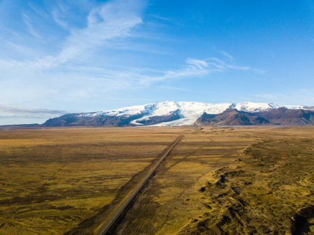 Road leading towards huge glacier and mountains in Iceland Vatnajokull glacier aerial drone image with street highway and clouds and blue sky. Dramatic winter scene of Vatnajokull National Park, Iceland, Europe. Beauty of nature concept background.