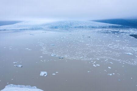 Aerial drone view of floating icebergs. Fjallsarlon glacier lake in Iceland. Global warming, melting glaciers, climate change concept