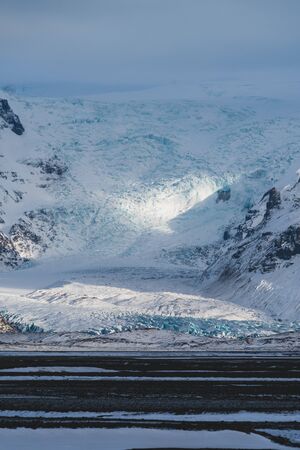Huge majestic glaciers icy surface by snowy mountain in Iceland