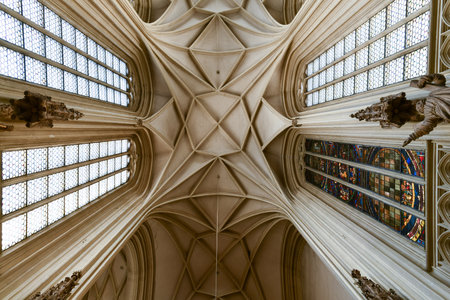 Capture the essence of gothic architecture in this stunning image featuring an intricate ceiling, beautiful stained glass, and a serene atmosphere.