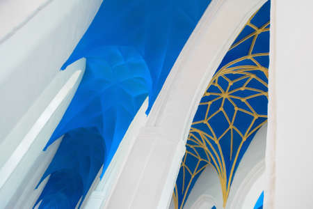 Blue and yellow ornamental church ceiling nave and white arches, fragment