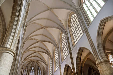 Graceful Gothic renaissance stone arches and matching tall arched windows in the interior of an old historic church in Amsterdam, Netherlands