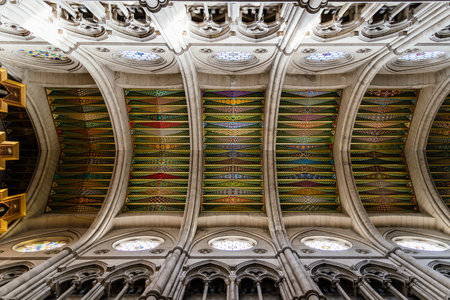 Ceiling detail view of curves and lines converging in the architecture design of an old cathedral in the United Kingdom