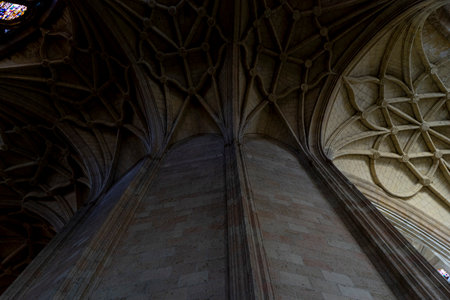 The ornate design of a vaulted ceiling showcases detailed stonework and arches in a historic cathedral.