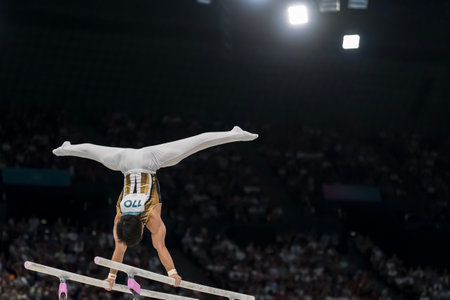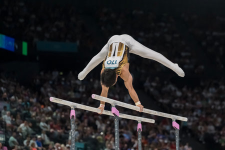 A gymnast mid-routine, flipping above the parallel bars with incredible precision