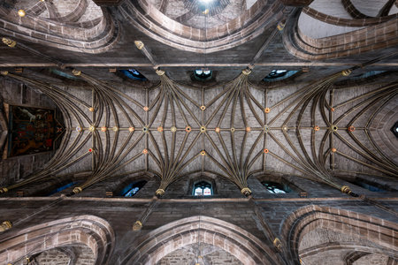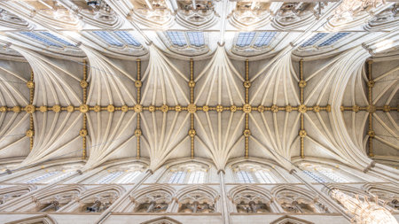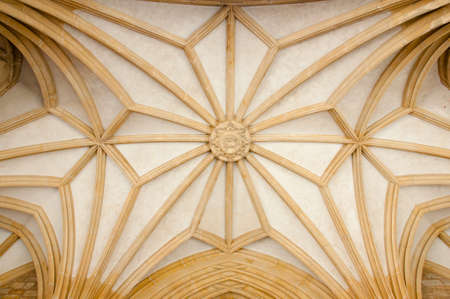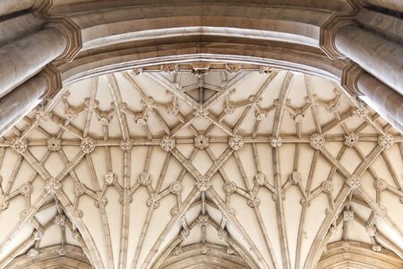 Ceiling detail view of curves and lines converging in the architecture design of an old cathedral in the United Kingdom