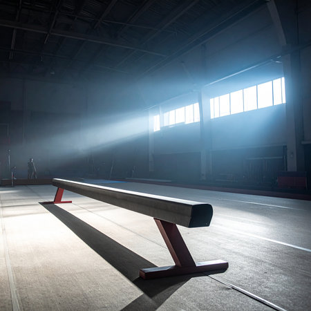 A balance beam in a sunlit gymnasium with dramatic light rays and shadows casting across the floor.