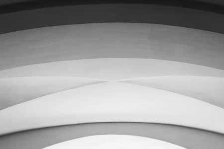 An abstract architectural ceiling features repeating curved white ribs creating a symmetrical ribbed pattern.