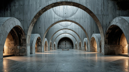 Stunning brutalist architecture featuring repetitive concrete arches with warm ambient lighting. Perfect for architectural portfolios, design concepts, and modern interior spaces.