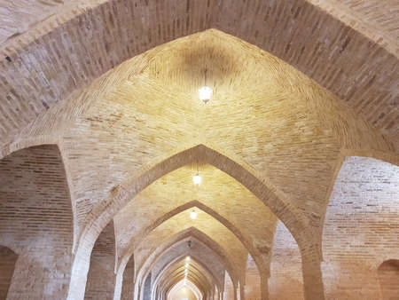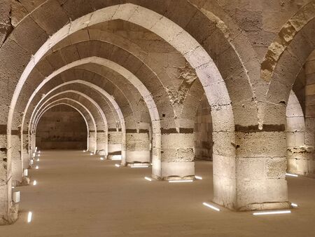 Row of rock arches with lighting at a historical caravanserai