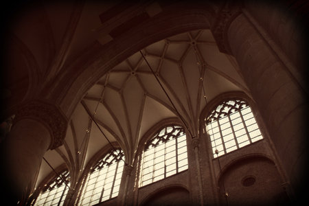 Graceful Gothic renaissance stone arches and matching tall arched windows in the interior of an old historic church in Amsterdam, Netherlands