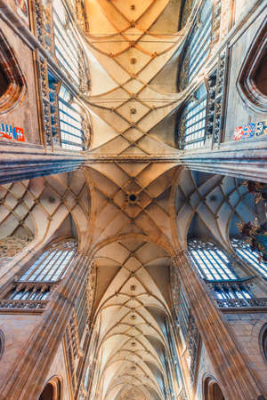 Prague, Czech Republic - July 2022. Dome in St. Vitus Cathedral. Grand interior, gothic ornamental details of roof inside. High ceiling, most famous church in Castle.