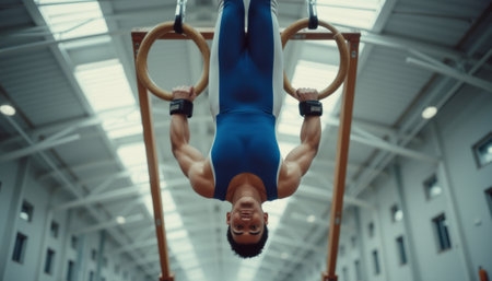 A muscular male gymnast is skillfully suspended upside down on gymnastic rings, showcasing strength and precision. The image captures the athletes intense focus and determination, set against a spacious gym environment with high ceilings and bright lighting.