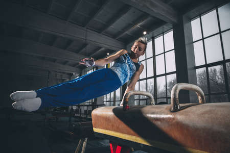 Leader. Little male gymnast training in gym, composed and active. Caucasian fit boy, athlete in sportswear practicing in exercises for strength, balance. Movement, action, motion, dynamic concept