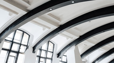 Discover the beauty of modern architecture with this image showcasing elegant exposed beams and large windows that illuminate an indoor space.