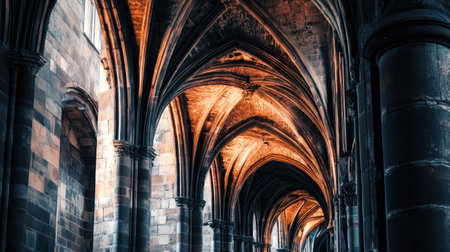 Explore a stunning Gothic architecture featuring intricate arches illuminated by warm light. This captivating interior showcases the stone craftsmanship and historical essence.