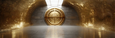 Inside the beautifully designed vault, a large golden door stands as a focal point, surrounded by smooth, reflective surfaces and bright lighting.