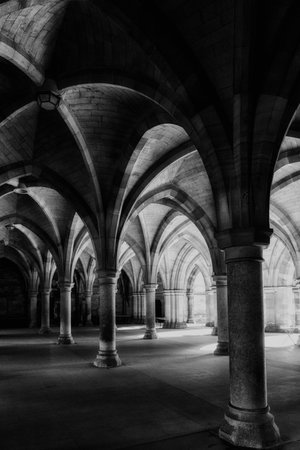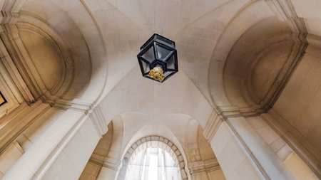 Gothic archway interior features intricate stonework and lighting, highlighting historical architecture and structure within a classic building.