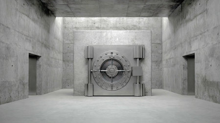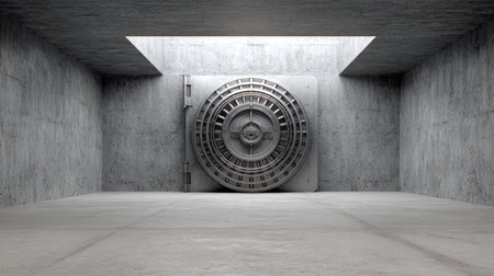 A sleek, modern vault door stands prominently in a stark concrete room, highlighting themes of security and strength with soft, ambient lighting.