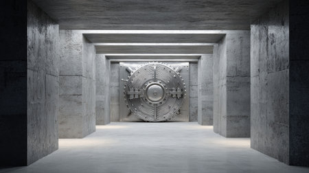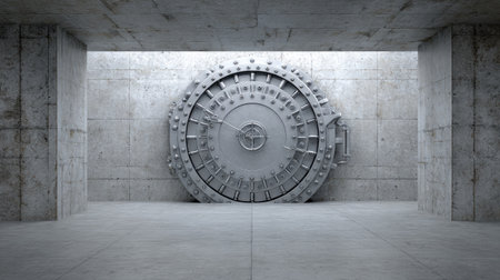 This image features a large, secured bank vault door in a stark concrete environment, highlighting themes of security, protection, and modern architecture.