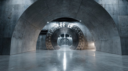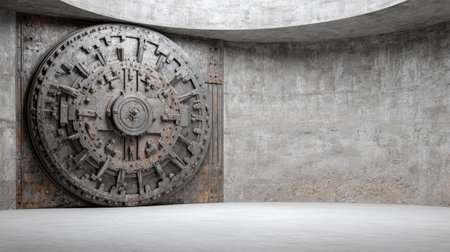 A striking image of a massive industrial vault door set in a modern concrete room, emphasizing security and protection in design. The image captures the essence of strength and reliability, highlighting the unique architectural features of the environment.