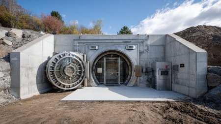 This image captures a secure entrance to a modern underground facility, showcasing a large steel door, concrete structure, and rugged surroundings.