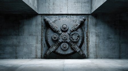 A striking industrial vault door crafted from metal, adorned with intricate gears, set against a stark concrete wall. Perfect for themes of security and strength.
