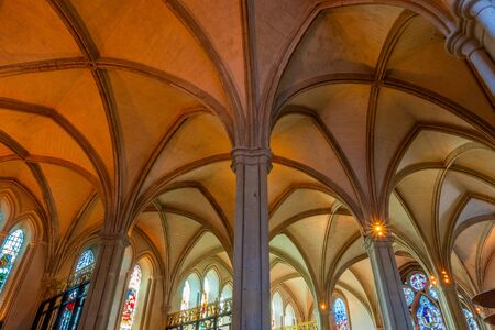 The arches of the catholic temple. Cathedral inside. Gothic.