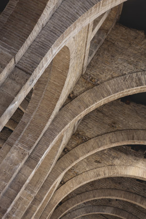 Stunning view of an artistic concrete architecture featuring arching ceilings and circular windows. The interplay of light and shadow creates an intriguing atmosphere.