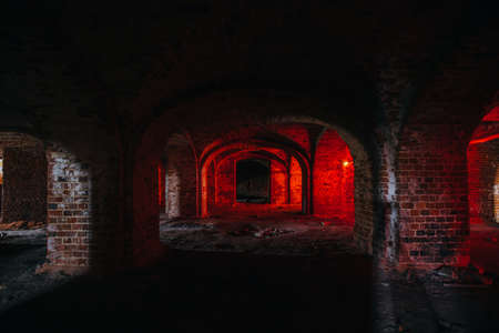 Dark and creepy vaulted red brick dungeon