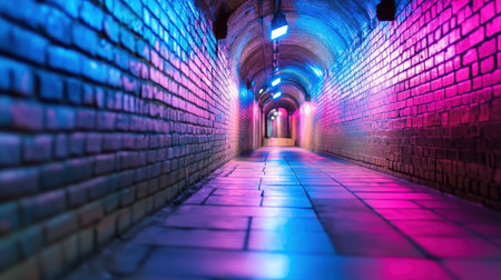 Retro-style lighting in a narrow tunnel, with pink and blue hues blending on the bricks.