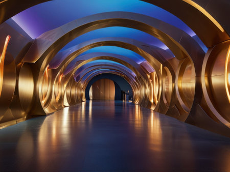Futuristic golden corridor with organic curves and polished surfaces, illuminated by ambient lighting creating a sci-fi atmosphere.
