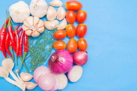 organic fresh colorful vegetables with potatoes, tomatoes,coriander,chilli, onion. Minimalism on blue background.Copy space for your text.