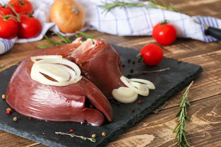 Raw liver ready to Cook on a wooden board in the rustic kitchen, cooking process. Concept of healthy eating