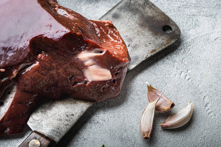 Raw beef liver on gray background.