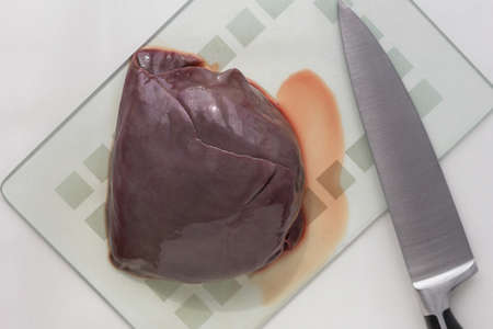 Top view of raw piece of liver with blood on glass cutboard and knife on the white background
