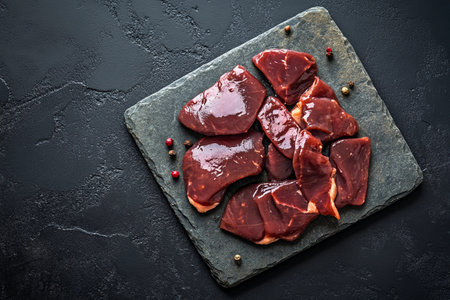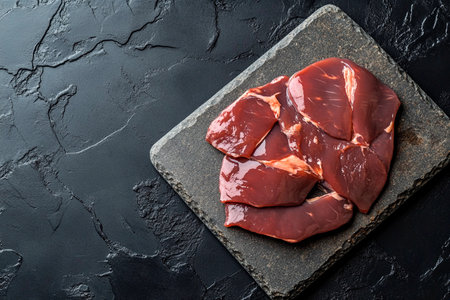 Food concept Organic Fresh slice raw beef liver on black slate board with copy space